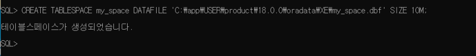 CREATE TABLESPACE <테이블스페이스 이름> DATAFILE '<데이터파일 경로명>' SIZE <데이터파일 크기>
