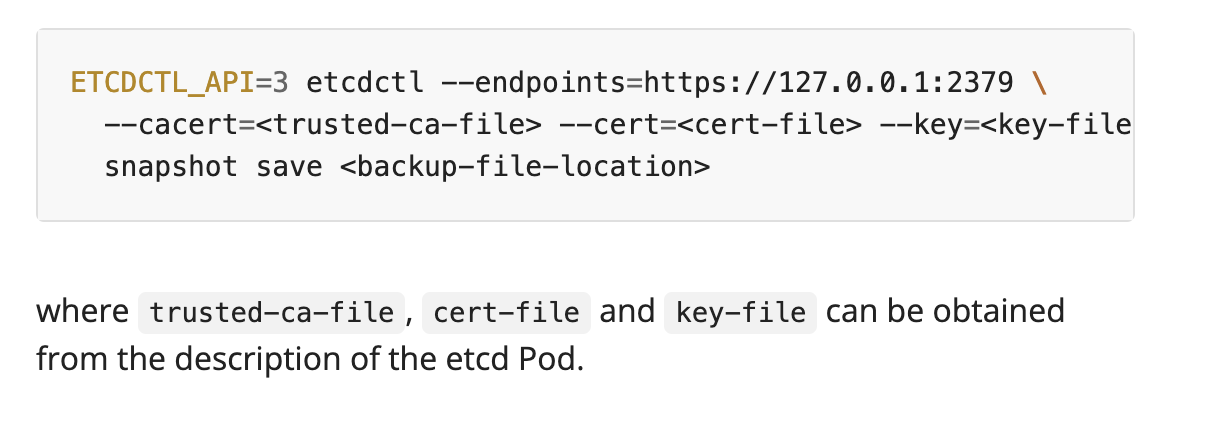 공식문서에 따르면 위 명령어로 ETCD 백업 할 수 있고 세부 파일 위치는 etcd 파드를 describe 하라고 나와있다.
