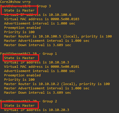 f0/0.10 인터페이스에 접속하고 vrrp로 코어 스위치 2개가 같이 사용할 ip를 설정하면 된다. 10.10.10.3은 위에서 vpcs에 설정한 게이트웨이 주소이다. vrrp 1 ip.. 에서 1은 그룹넘버이다. vrrp 설정을 group으로 관리하는데, vrrp를 vlan 넘버와 일치하면 관리하기 편하다고 한다. ( 나는 몰라서 그냥 1로 했다. )