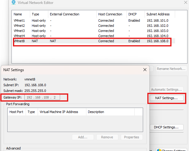 VMnet8의 NAT settings를 확인하면 NAT 어댑터의 게이트웨이 주소를 확인할 수 있다.