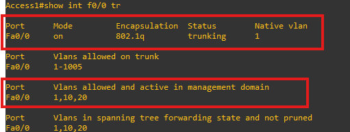 위 그림 처럼 트렁크 설정을 확인할 수 있고 트렁크를 통해 트래픽 이동이 가능한 vlan도 확인할 수 있다.