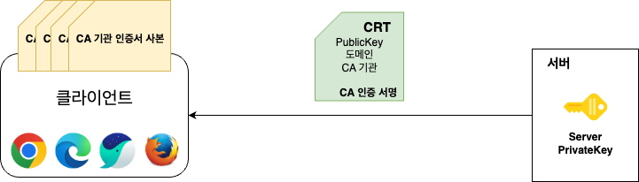 웹브라우저(클라이언트)는 이미 공인된 CA 기관의 인증서 사본을 내장하고 있다. 서버로부터 CRT 인증서가 날라오면 CA기관의 PrivateKey로 서명된 CRT의 인증 서명을 CA 인증서 사본에 포함된 PublicKey로 검증한다. 검증에 성공하면 클라이언트가 접근한 서버가 해당 도메인의 소유자가 맞음이 검증된 것이다.