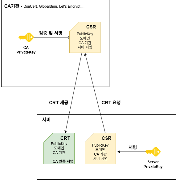 CSR의 PublicKey로 서버가 PrivateKey로 한 서명을 검증하고 도메인의 소유자가 해당 서버가 맞는지 등의 검증작업을 진행한다. CSR 검증이 완료되면 CA 기관은 CA의 PrivateKey로 인증 서명을 하는데, 이렇게 생성된 인증서가 CRT 파일이다. CA는 서버에게 자신이 서명한 공인된 CRT 파일을 제공한다.