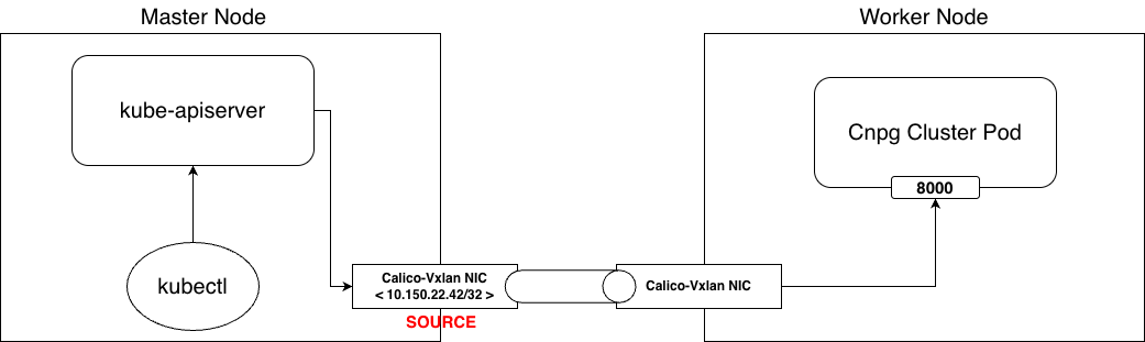 kubectl 명령어를 보내면 kube-apiserver가 프록시 서버 역할을 해주어 파드 쪽으로 트래픽을 라우팅을 해준다. 이때 타고 나가는 네트워크 인터페이스가 calico-vxlan이다. Cnpg Cluster Pod 입장에서는 특정 네임스페이스에서 들어오는 트래픽이 아니라 특정 IP에서 들어오는 트래픽이므로, 해당 트래픽은 NetworkPolicy에서 IpBlock 설정으로 허용해주어야 한다.