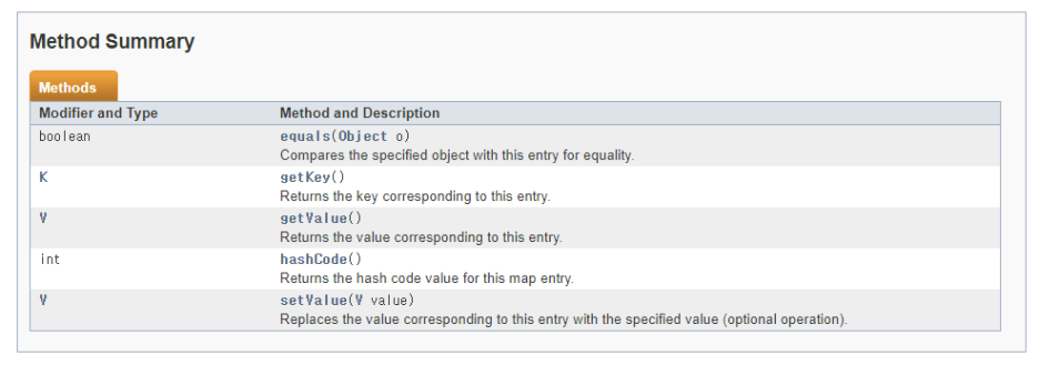 Map.Entry<K,V> 인터페이스의 추상메소드들이다. 해당 인터페이스를 구현하려면 기본적으로 key와 value를 반환하는 로직(getKey(), getValue())과 value를 재설정하는 로직(setValue())을 구현해야한다. key는 final 속성으로 수정이 불가능하므로 setKey()는 없다.