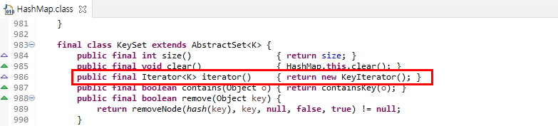 접근모듈의 기능을 구현하는 KeySet 클래스를 살펴보자. 메소드에 iterator()가 있다. iterator는 반복자를 의미한다. 반복자는 중요한 메소드이다. HashMap은 버킷에 Map 데이터를 index 순서대로 저장하지 않는다. 그래서 단순히 for문이나 while 문으로 탐색하지 못한다. 탐색에 필요한 모듈인 iterator()가 필요하다.