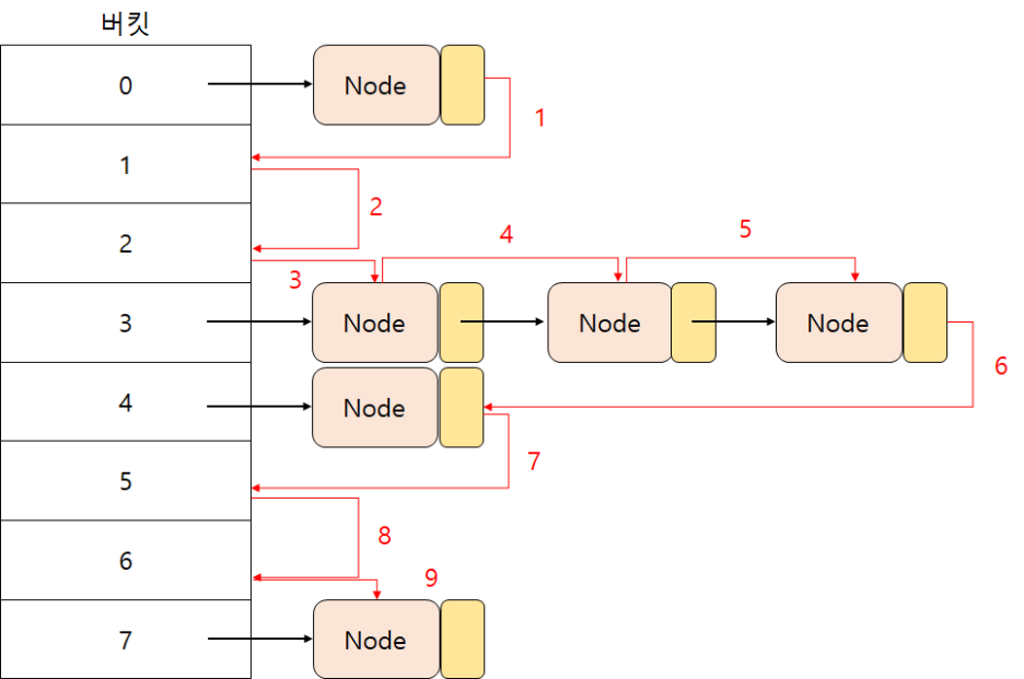그래서 key값을 알면, 버킷의 위치를 바로 알 수 있어 HashMap은 시간 복잡도가 O(1)인 빠른 성능을 자랑한다. 그러나 key는 무한하지만 인덱스는 한정되어 있어 key들 간의 인덱스를 향한 충돌은 불가피하다. 그래서 충돌이 일어나는 인덱스에 또 다른 자료구조가 만들어 지는데 충돌 초기에는 Linked List 방식으로 Map 데이터가 저장된다.