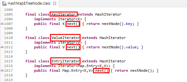 next()는 로직은 같지만 접근하는 필드가 다르므로 iterator 종류별로 클래스에 구현되어 있다. KeyIterator는 접근한 Map 데이터(Node객체) 의 key 필드 안에 저장된 key 객체 주소를, ValueIterator는 Node 객체의 value 필드 안에 저장된 value 객체 주소를, EntryIterator는 Node 객체의 주소를 반환한다.