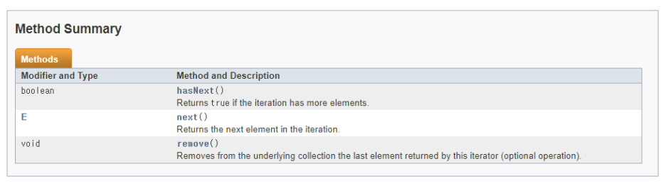 Iterator 인터페이스 추상메소드는 3개다. hasNext()는 자료구조 안에 데이터의 유무를 확인하는 메소드, next()는 데이터가 있다면 데이터 하나 가져오는 메소드, remove()는 가장 최근에 next()를 통해 가져왔던 데이터를 자료구조 안에서 삭제하는 메소드이다.