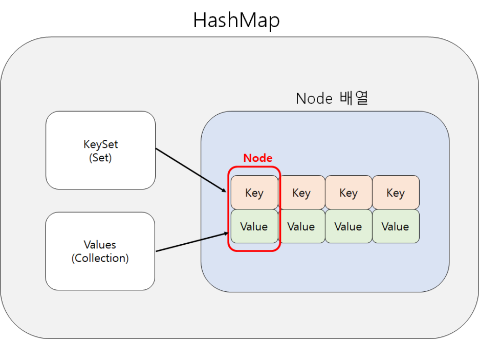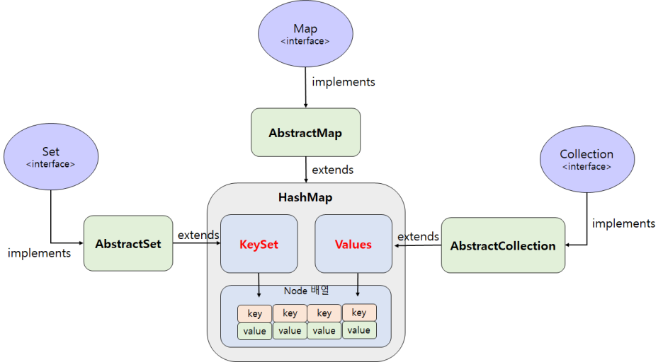 쉬운 이해를 위해, 3번은 제외하고 key 집합과 value 집합만 다루어 보겠다. 두 집합은 서로 성격이 다르니, 성격에 따라 다르게 개발자에 의해 분리되어 활용되어질 수 있다. 그러므로 Node로 묶여있는 key 필드와 value 필드에 독립적으로 접근 가능한 접근모듈을 만들어 줄 필요가 있다. 그것이 바로, keySet()과 values()이다.