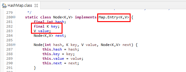 HashMap 클래스 안에는 중첩 클래스로 Node 클래스가 있다. Node 클래스는 HashMap의 버킷 안에 저장될 Map 데이터이다. Node 객체는 필드값으로 key와 value를 갖고 있으며 key는 final로 선언되어 한번 초기화되면 수정이 불가능하다.