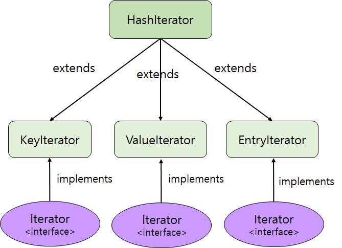 접근 모듈 세 가지, KeySet, Values, EntrySet은 모두 각자의 iterator를 갖고 있다. KeySet은 KeyIterator(), Values는 ValueIterator(), EntrySet은 EntryIterator()를 갖는다.