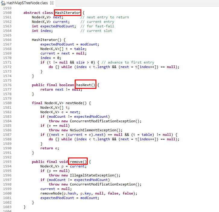 Iterator 인터페이스를 implements하면 위의 세 가지 추상메소드를 구현해야한다. hasNext()와 remove()는 KeyIterator 클래스, ValueIterator 클래스, EntryIterator 클래스에서 모두 같은 로직이기에 코드의 중복을 방지하고자 HashIterator 클래스를 상속하여 처리했다.