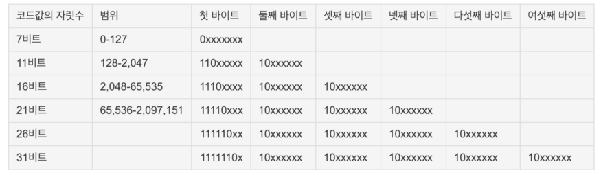 한글은 UTF-16에서 2byte지만 UTF-8에서는 3byte를 차지한다. 아스키 코드 문자들을 7bit 데이터로 표현하기 위해서, 나머지 문자 데이터에 메타데이터가 붙는 것이다. 그래서 UTF-8은 데이터의 크기가 8bit + a 로 가변적으로 변한다.