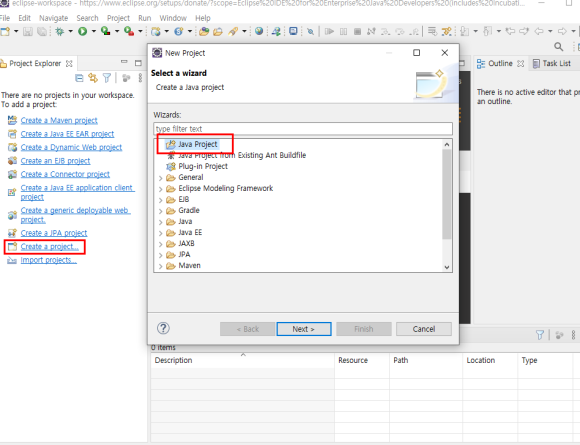 자바프로젝트를 생성해준다.