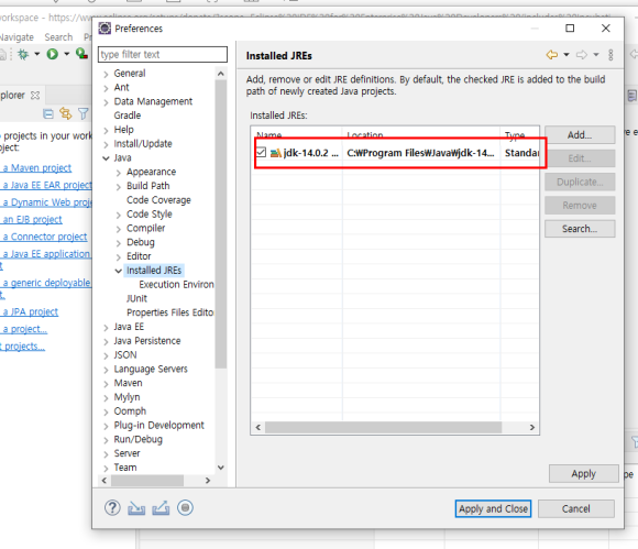Java에 installed JREs를 클릭해보면
