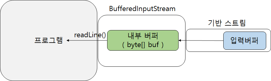 BufferedInputStream 객체가 없다면 기반스트림 객체를 통해 입력버퍼에서 데이터를 받아야 한다. 그러나 프로그램 입출력 속도와 입력버퍼의 입출력 속도는 서로 다르다. 그러므로 둘 사이에 완충지대로 내부버퍼를 놓는다면 입출력에 지연이 생겨도 내부버퍼 안에 데이터가 미리 대기하고 있므로 지연 발생없이 속도는 향상된다.