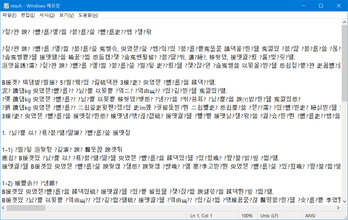 디폴트로 MS949 인코딩방식이 설정되어 있다. 그렇다면 UTF-8 인코딩 파일을 MS949 방식으로 디코딩한 것이다. 그럼, 당연히 복사된 파일은 문자가 깨져있을 것이다. 한번 확인해보자.